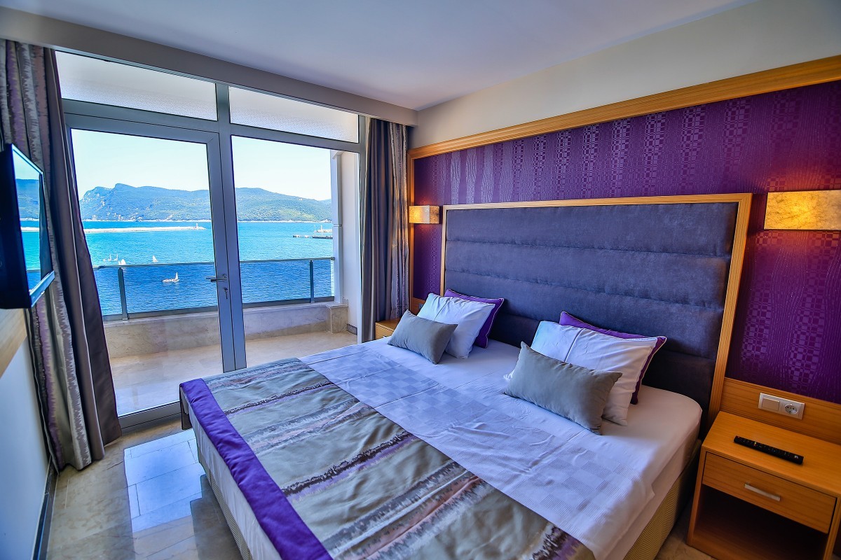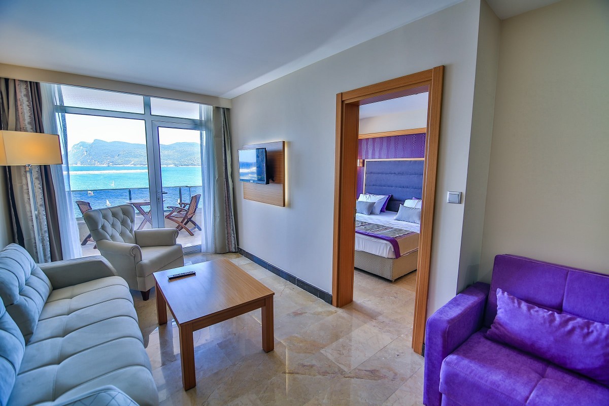 İki odadan oluşan suit odamızda maksimum 4 kişi konaklayabilir. Banyosunda jakuzi bulunmaktadır. Balkondan plaj ve deniz manzarası izlenebilmektedir.